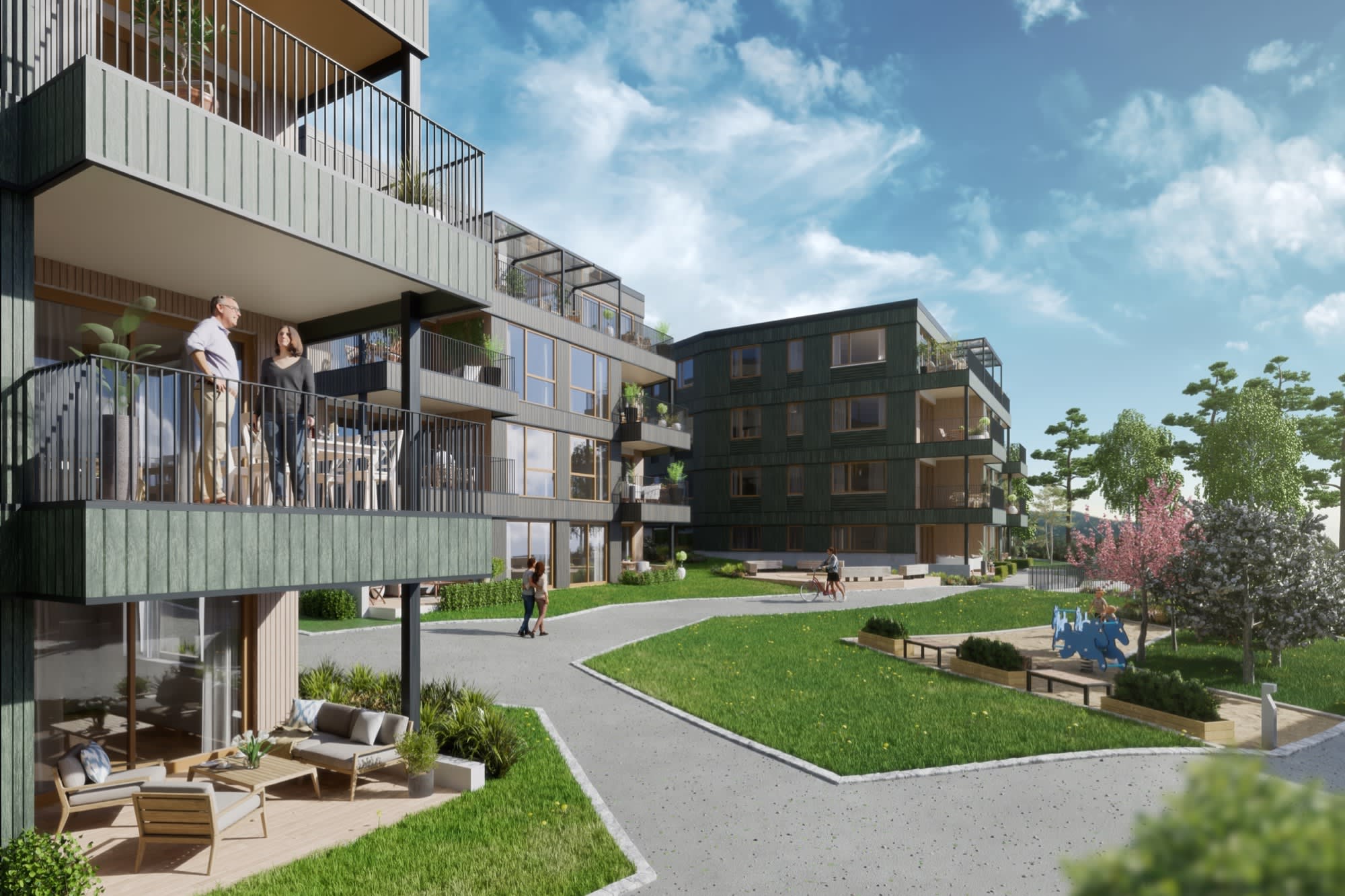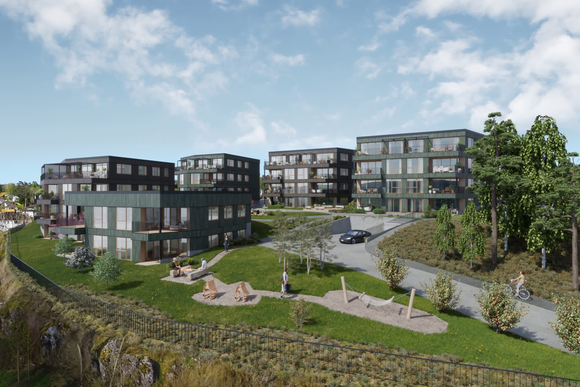 Fjord Arkitekter har tegnet prosjektet og hatt naturen i tankene hele veien. Alle de fem byggene får utvendig trekledning – i farger som trekkes harmonisk mot det grønne i naturen.
