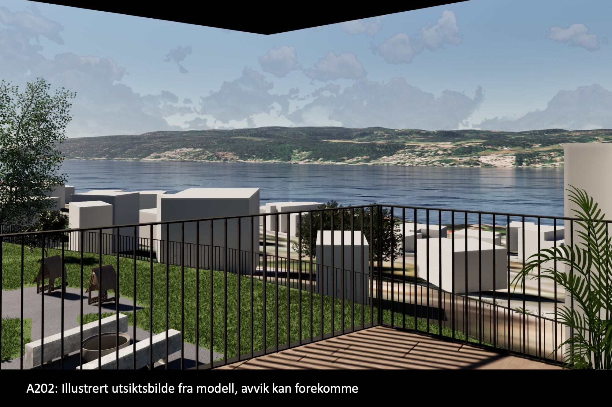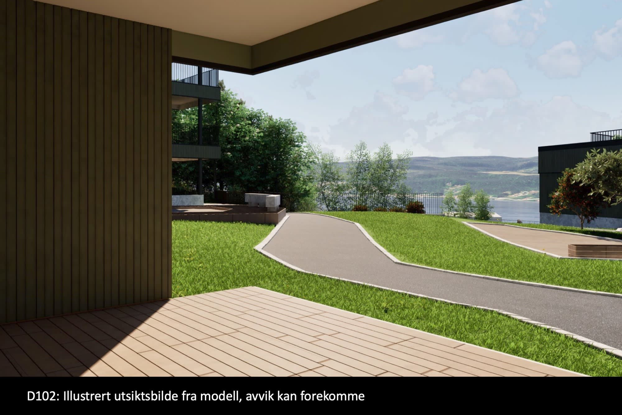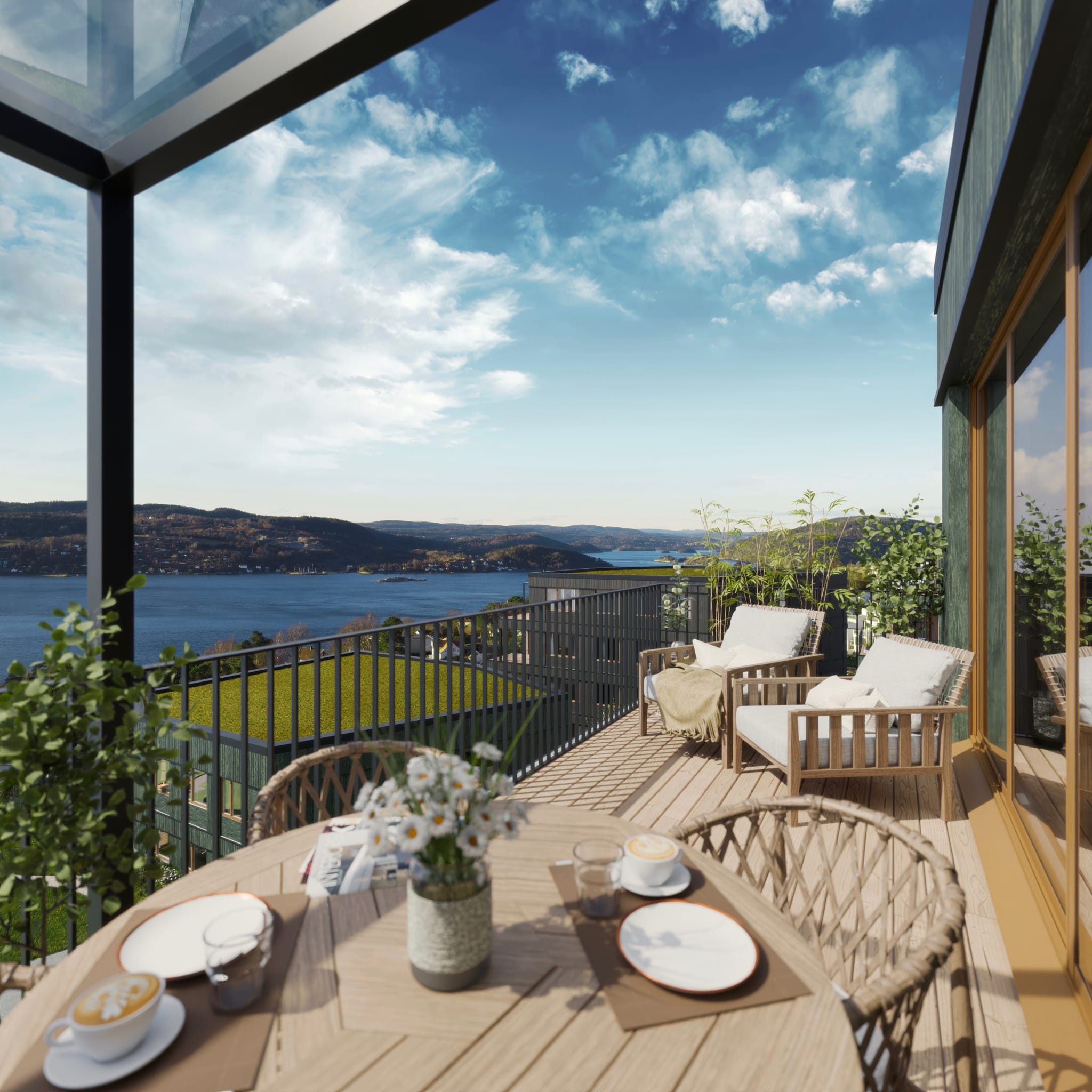 Her kan du bla deg gjennom illustrasjoner av uteplasser med en tilhørende utsikt. Klikk deg videre inn til aktuell leilighet i boligvelger og se planløsning, arealer og priser.